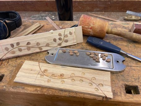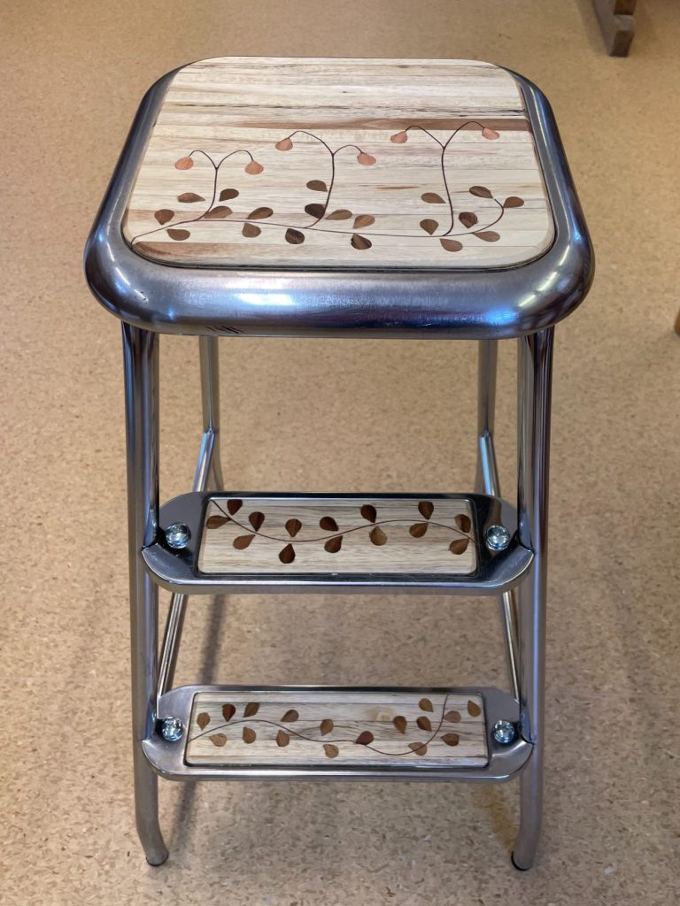 Pallen rengjordes från all gammal färg och polerades. Undersidorna borstades och målades med rostskyddsfärg. På stegen gjordes en intarsia av Biltemas trästickor som behandlades med hårdvaxolja.