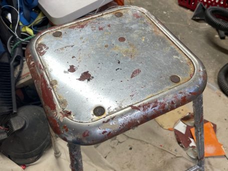 En klassisk AWAB-pall, praktisk, robust och i det närmaste outslitlig om den tas om hand. Just detta exemplar har dock använts som målarstege och förvarats kallt och fuktigt vilket har gjort att den både prytts av diverse färgfläckar och rostat under stegen.